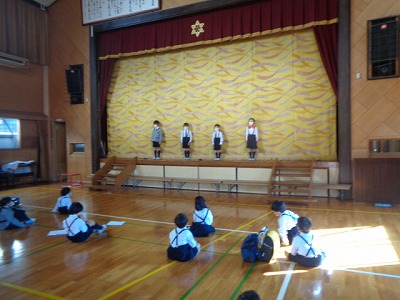 今日の練習は、いつもの練習のめあて「大きな声でハキハキ・動きを工夫する/そろえる」に加えて、舞台に上がる前の直前準備の動きにも、めあてを持って練習しました。