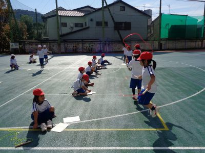 縄跳びでは「前跳び」「後ろ跳び」「かけ足跳び」の練習をしました。