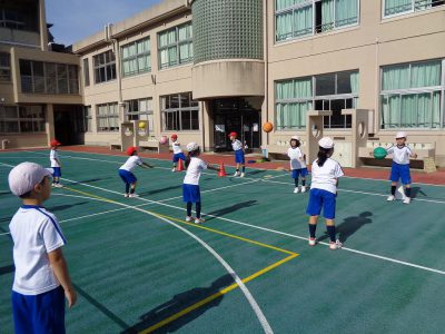 ボール運動では、ボールゲームに向けて、パスの練習をしました。