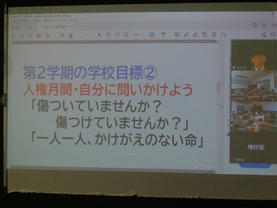 なお、後期目標は本校の人権月間から「自分に問いかけよう きずついていませんか きずつけていませんか」「一人一人、かけがえのない命」です。