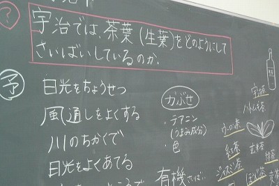3時間目の社会は「宇治茶がどのように作られているのか」という学習問題です。みんなで予想して、実際に京都府和束町で行われているお茶作りの映像を見ながら調べていきました。同じ茶葉でも、作り方ひとつで緑茶・紅茶・ウーロン茶などのいろいろな味のお茶が生まれるということや、その作り方によって、うまみや風味が変わるという事を知りました。