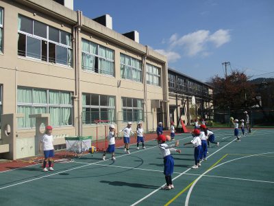 ペアのお友達がキャッチしやすいように、投げ方やボールの強さを考えながら投げています。