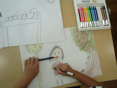 描いた絵に番号(①・②・③)をつけて、①の絵の場面のお話は③の絵の裏に書きます。