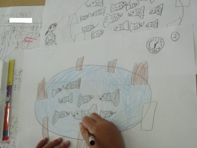 楽しい絵を仕上げた後は、裏にお話の文(問題文)を書いていきます。