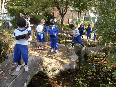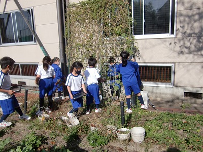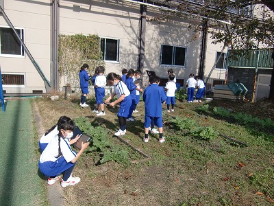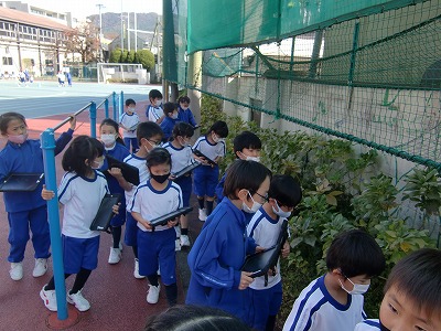 「あきとなかよし」というテーマで、学校の秋をタブレットで写しているようすです。花壇やビオトープに入って自然の変化に目を輝かせていました。
