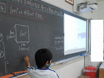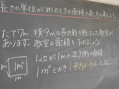 算数は「面積」について学習しています。今日は、周りの長さが「㎝」ではなく「m」の面積の求め方を考えました。これも、同じように計算できるのでしょうか?