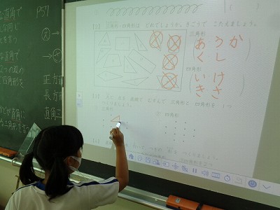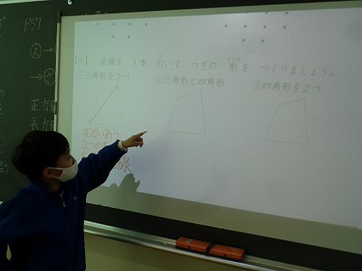 算数科では、「三角形と四角形」の復習&発展問題に取り組みました。まずは、これまでの復習です。正方形・長方形・直角三角形を言葉で説明する学習からです。