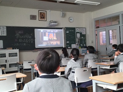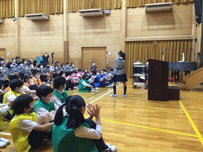 聞き手となる学年は、密を避ける点から、オンラインでライブ中継を通して教室で鑑賞したり、会場で鑑賞したりしました。