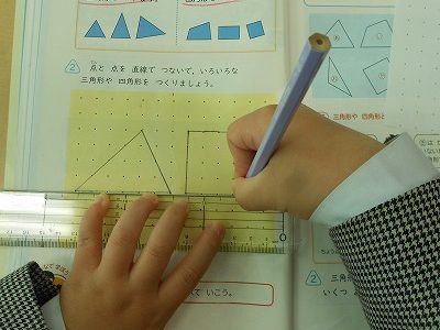 「三角形と四角形」の学習です。今日は、点と点を直線でつないで、色々な三角形と四角形をつくる活動に取り組みました。