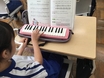 教室では、この歌の元となる「レミファソラレ」の音階を使った「音楽づくり」を行いました。8拍のうち7拍を音にして、最後のひと拍を休符にするという約束で始まりました。