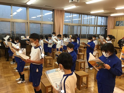 「♪雪のおどり」の輪唱を仕上げています。男子と女子に分かれ、列で分かれて、いろいろな仲間との輪唱に取り組みました。