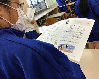 「♪小さい秋みつけた」の歌唱をひびかせています。低いシの音から高いミまでの、音域を歌う学年になったのだなと、5年生の歌声に聞き入りました。