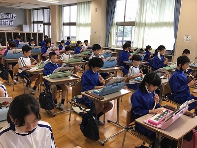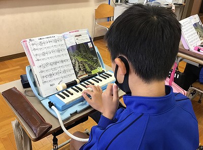 このあとは、「♪風とケーナのロマンス」の低音パート練習です。「ヘ音記号」のおさらいの後、鍵盤ハーモニカを使って、低音での伴奏フレーズの演奏に取り組みました。