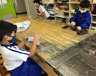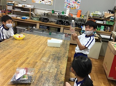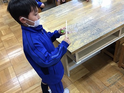 1つの楽器で、2こも3こも違う音を出すことが出来る発表をしてくれた友達に刺激され、短い時間に、面白い音がする楽器作りに取り組むことができました。
