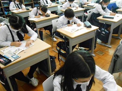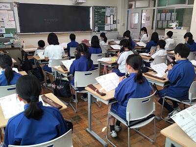 今日が最後の鑑賞です。期待の「沖縄全島エイサー祭り」を鑑賞できるとあって、みんなプリントの記入に力を入れていました。