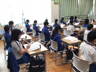 6時間目は、読書の時間です。今日は、読み聞かせ係の4年生が「宿題」というお話を読んでくれました。
