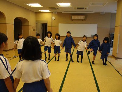 「ラジオ体操第一・第二」や「ヨガ」をした後に、「花いちもんめ」に似た英語ゲームをしています。