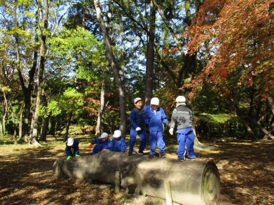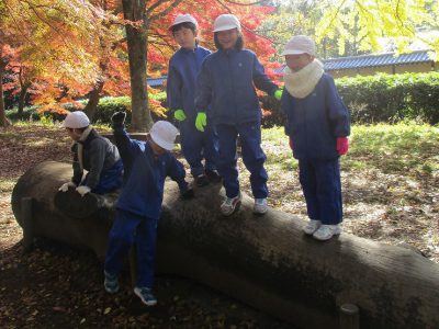 その後は、丸太の上に乗ったり、母と子の森文庫の本を読んだり、落ち葉や木の実を集めたりして楽しく遊びました。