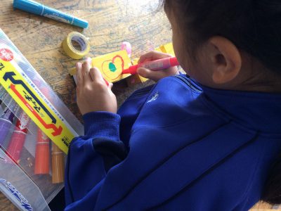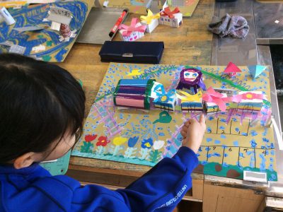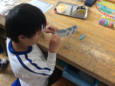 今日の前半は、自分の電車の最終点検を行い、付け足しや色づけを加える学習を行いました。