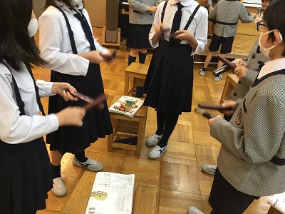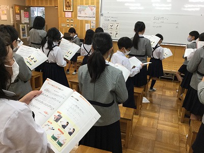 今日は、「ア」の部分をずっと歌うグループに、「イ」や「ウ」の部分を重ねる歌唱を行いました。それぞれが、明るい声で歌うことができたので、いろいろな組み合わせが楽しめました。