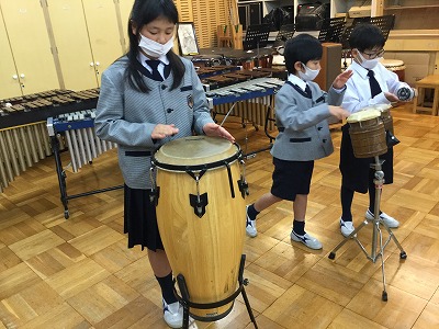 安定感のある音“コンガ”や“ボンゴ”の音を確かめています。片方の手を面に当てておくと、音がこもります。その手をはなすと、いつものまろやかな音が響きます。