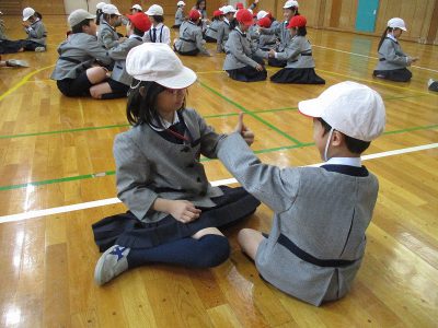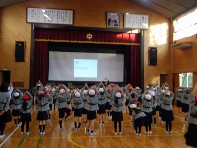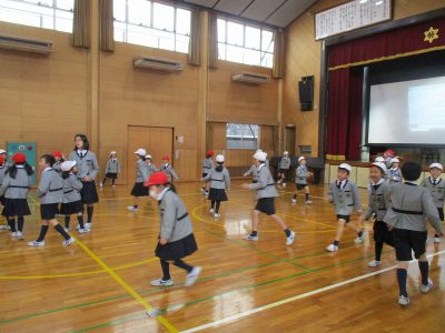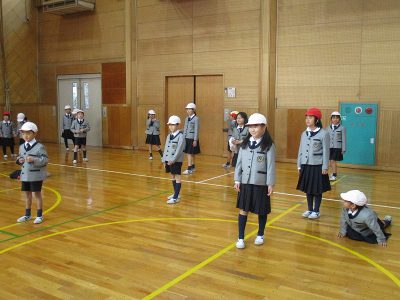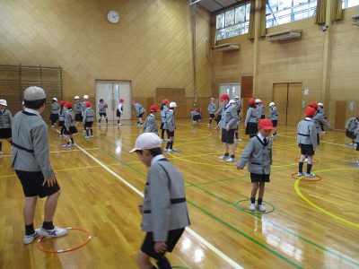スタート前から制服に着替えた低学年が数人、体育館前で待っています。