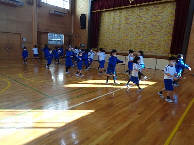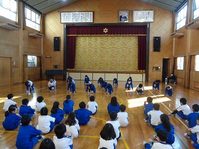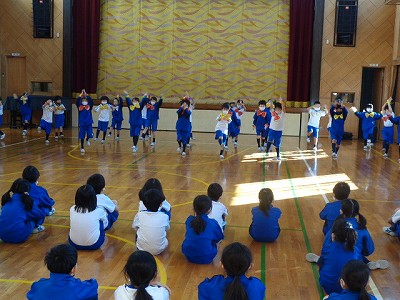 今日は、朝根っこの時間に1年・2年・4年で表現活動の発表会をしました。