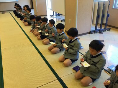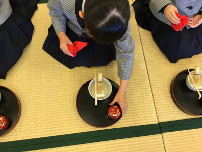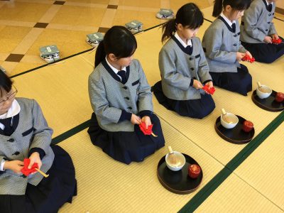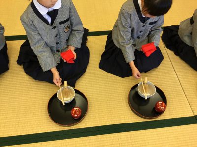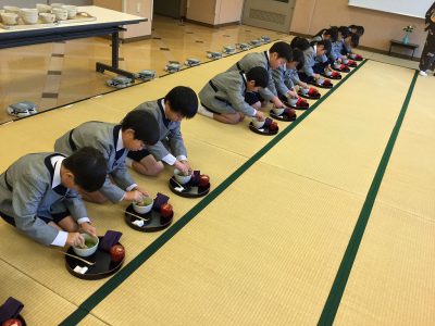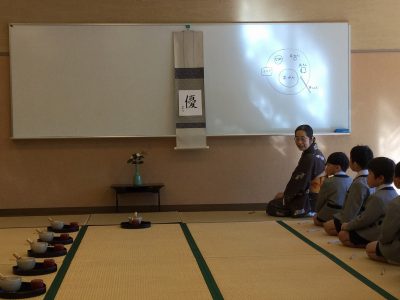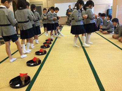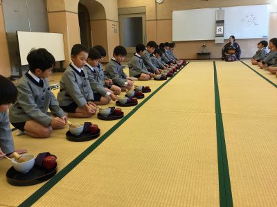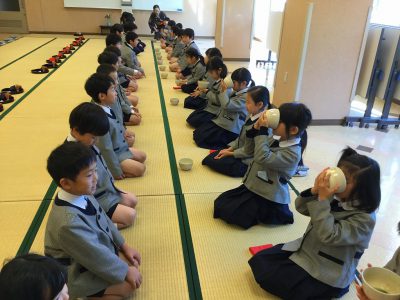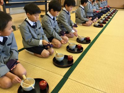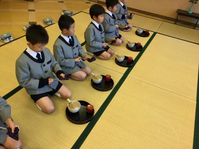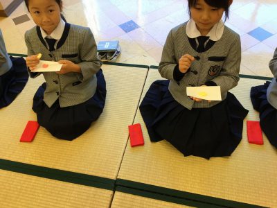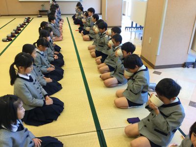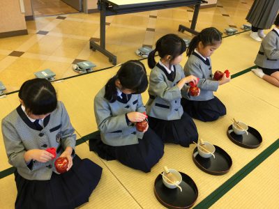 毎週金曜日は生活科の時間に礼法を行っています。先週から始まった礼法で、みっちりとおさらい(1年生の時の)を行ったので、今日は「お点前」のお作法に新しいことが加わると、先生からお話をいただきました。