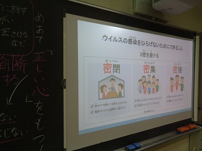 月かげの学習です。日本赤十字社監修「新型コロナウイルスがもたらす3つの”感染症”」の考え方をもとに、新型コロナウイルス感染症に関する差別・偏見について考える学習を行いました。
