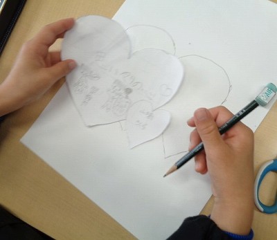 毎回使用している練習半紙を使って、習字の練習をしました。それに加えて、今日は人権月間の取り組みとして、墨で絵と言葉を書いて「大事にしたい言葉」を書きました。まずは、半紙を切り取ります。