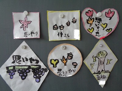 乾いたら、クーピーで色づけして完成!思いやり、支え合い・・・色々な言葉に秋の絵が添えられた作品です。