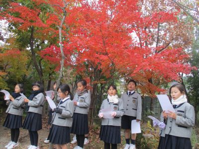外を見ると、紅葉があまりに美しかったので、外に出て紅葉の彩りと自然を感じながら、歌うことにしました。