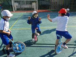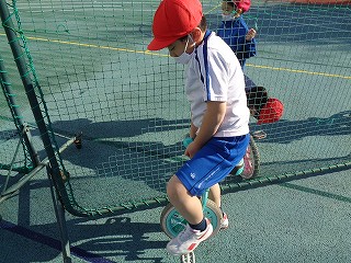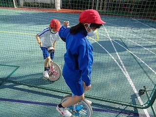 一方、一輪車のグループは物に掴まらずに乗れるように練習を進めました。