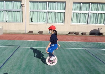 友達と手を取り合い、助け合って練習することはできませんが、学習を重ねることで進める距離が長くなったり、一人で一輪車に乗れたりすることができた喜びをクラスで味わいたいなと考えています。