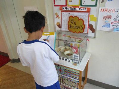 給食のことを知らせようと、今日の献立を書(描)いています。
