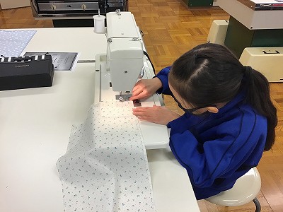 布端が縫えたら、布を3等分に折りたたんで、目印をつけ、手順にそってどんどん縫い進めます。縫い始め、縫い終わりの返し縫いを忘れないように気をつけました。