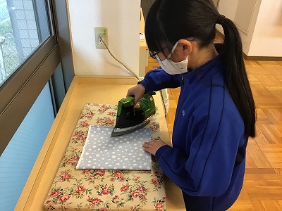 アイロンで折り目をしっかりつけながら、丁寧に作業を進めています。