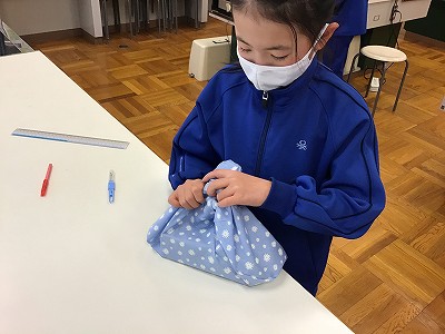 今日のECO生活クラブの活動は「まちつきあづま袋作り」です。あづま袋は布を1:3の比率にすれば簡単に作りことが出来ます。布の大きさで袋の大きさを自由に変えることができ、今回はお弁当箱を入れるのに、ちょうどよい大きさのあづま袋を作りました。