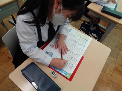 「ドド・/レレ・/レレ・/ミミ・」と低音のような音の流れが、2年生にピタッとおさまったようで、“エア”練習では、すぐに口ずさみながら、指とリズムの練習に取り組んでいました。