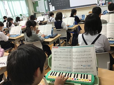 教室では、メロディパートと伴奏パートを合わせて奏でる時間を過ごしました。“合奏”として完成させるためには、メロディの後半部分がきっちりと演奏できることがポイントです。ひとりひとりできるカ所を増やし、「鉄琴や木琴と歌」や「鍵ハモでの合奏」にと仕上げていきたいと思います。