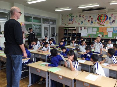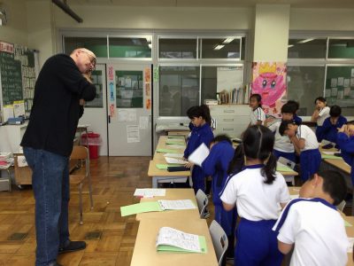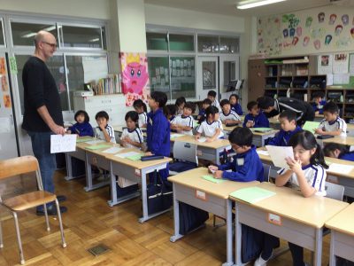プリントのさし絵や、英文の中の単語をヒントに、何をしている場面かをポール先生に話しています。