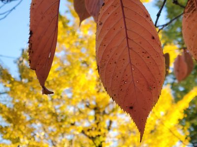 Now is the best time to see the fall colors of yellow Ginko trees and red Japanese Maple.