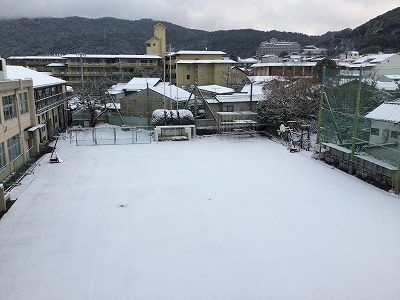 ご覧ください。5年生教室のテラスから眺めた“雪のグラウンド”です。