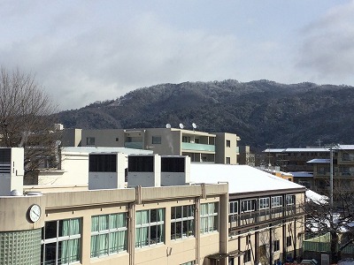 中間休みには、太陽がさしてきました。でも、北側の屋根はまだまだ白く、「大文字山」の“大の字”も白く残っていました。