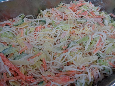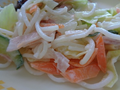 ☆ 米粉スパゲティは、パスタの形に合わせて、野菜やハムを切りそろえています。