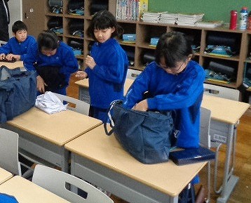朝の会では、チェック係の声かけで、文教かばんやお道具ぶくろの整理をしました。