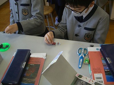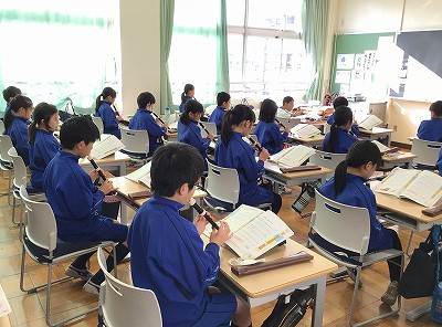 教室に戻り、実際に音を出して、響きや音程を確かめます。まだまだ、一定の音が伸びず、苦心しています。学校での練習は短いので、家での自主練習をすすめています。