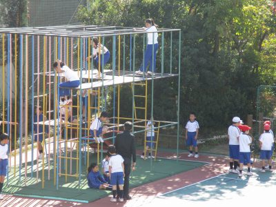 ジャングルジムでは、教頭先生と楽しくおしゃべり。