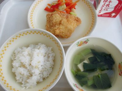 今日の献立には、野菜がたくさん入っています。すまし汁には玉ねぎ、小松菜。
