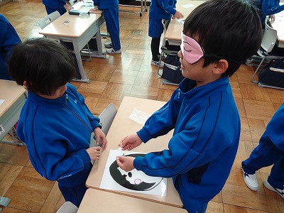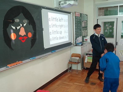 上下左右や「これは~だよ。」「少し・・・」「逆さだよ。」「止まって!置いて!」、ほめ言葉……、などの英語表現を使っての取り組みです。